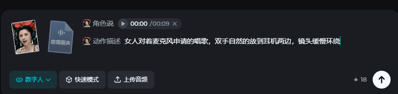 多准备几张图4. 对口型视频制作依然是即梦,选择数字人上传你生成好的人物图片,以及前面生成的音乐写上动作描述词描述词具体的可以点击下面蓝色字体查看另一篇详细说明,这里我就不啰嗦AI歌手录音棚唱歌视频制作,超级简单,流量超爆