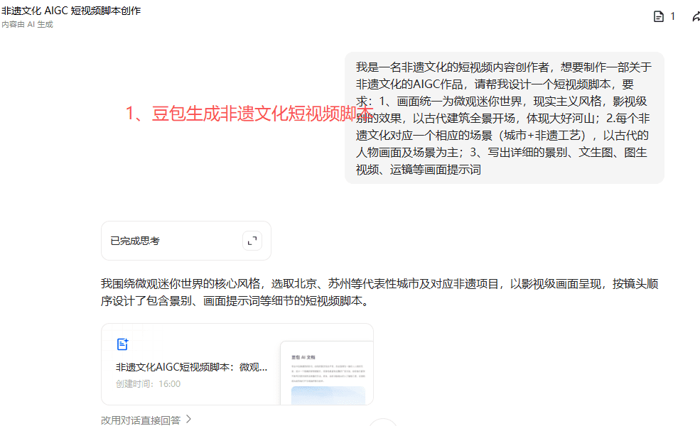 今天,用一条提示词,就可以让豆包给你写出一份完整非遗产品视频脚本,并且可以用即梦生成完整的视频。