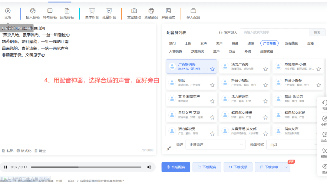 生成的脚本包含:文生图提示词、图生视频提示词、后期剪辑的音效和旁白
