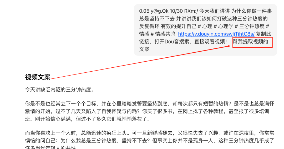 怎么样,视频是不是也非常的简单,确实简单,简单到只有黑白两个颜色,这类视频的高明之处就在于,他抓住了当代人在快节奏生活中普遍存在的问题,让大家自己来体会其中的道理,引发共鸣,进而达到突破流量池的目的。 下面就跟随晓晓洋的脚步来看看,这类视频是如何制作出来的! 第一步:生成文案 生成文案,咱还是使用我们的老朋友—豆包,因为用的多了,他也能记住我们的创作风格,能更精准的体会到我们指令的意思。 首先要复制对标视频,将链接扔给豆包,让豆包给我们提取文案,如下图所示: