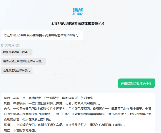 画风:写实主义,高清晰度,户外自然光,电影级画质,色彩明亮。构图:中景镜头,一位女性记者和婴儿并排,记者手持麦克风对着婴儿。内容:一位身穿深色西装的短发女性中国记者,手持银色麦克风,侧身面向一个戴着黄色外卖员小帽子、穿着印有外卖标志围兜和尿布的中国婴儿。婴儿正脸,正对着前面眼睛看着镜头,婴儿站在地上。婴儿的表情严肃而略带愁容,似乎在认真回答问题。场景:一个热闹的街口,有川流不息的车辆、来来往往的行人、街边的店铺招牌(模糊)。地面:灰色的水泥路面。