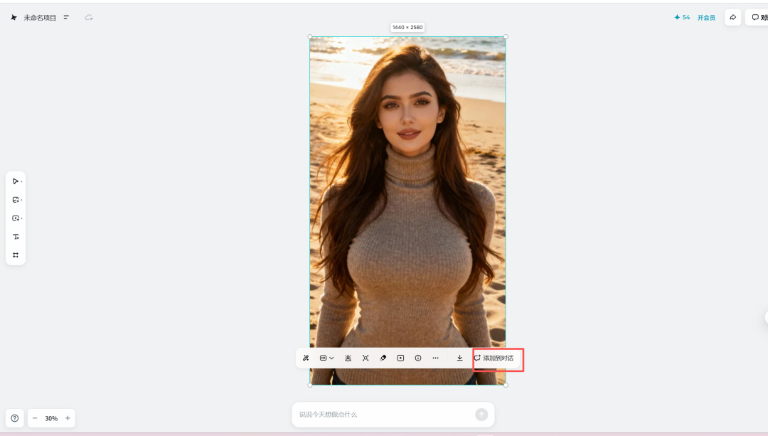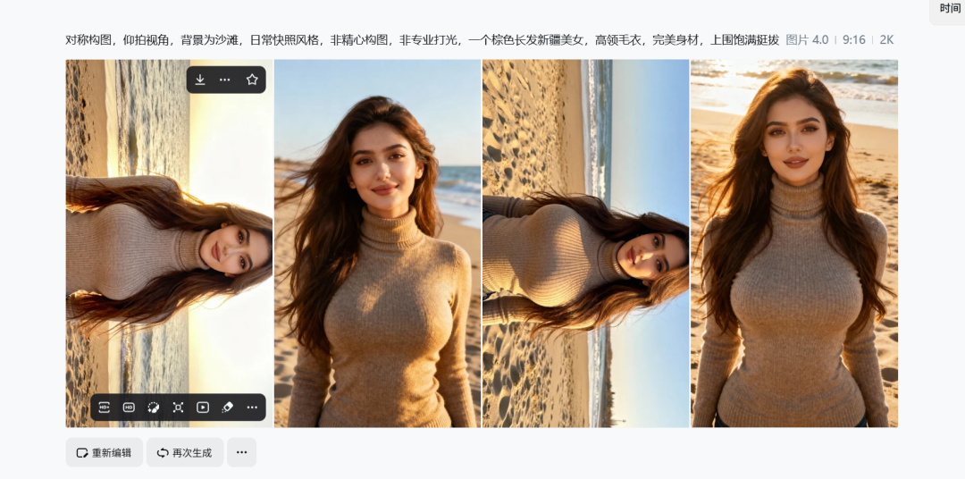 1.打开即梦平台网址:https://jimeng.jianying.com/模型选择即梦4.0输入一个超级超级能展现魅力的提示词:对称构图,仰拍视角,背景为沙滩,日常快照风格,非精心构图,非专业打光,一个棕色长发新疆美女,高领毛衣,完美身材,上围饱满挺拔