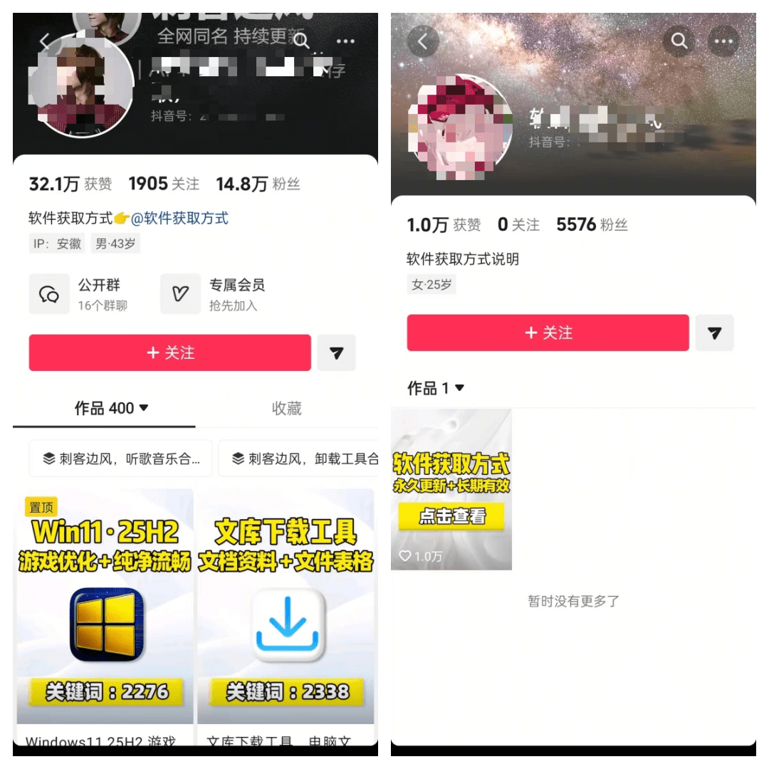 先来看下抖音的对标账号和引流方式,主页放个@小号的链接,然后小号里放引流方式,引入私域,用户要软件,发给它链接。