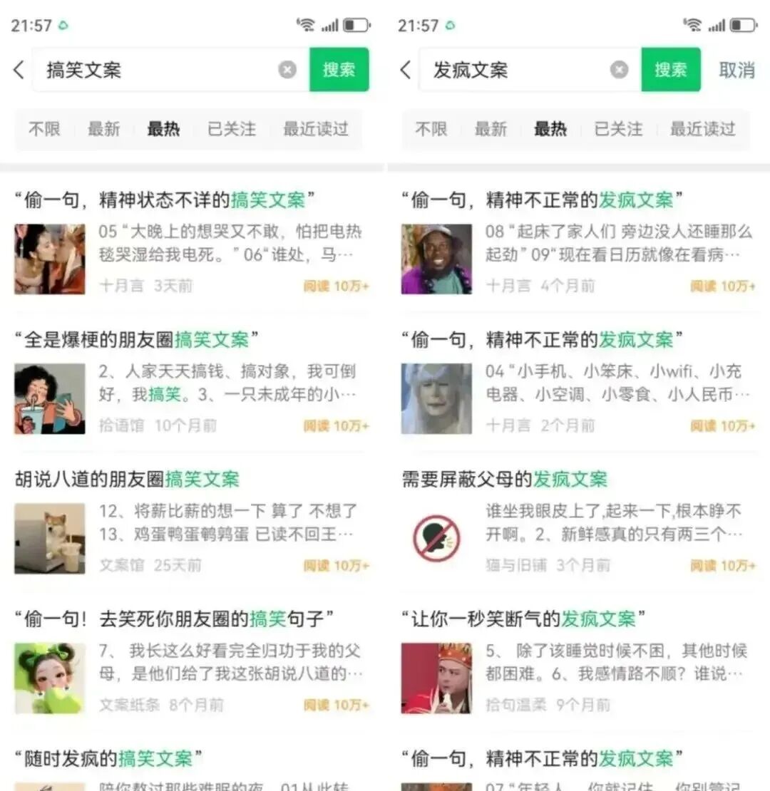 比如说,你搜“搞笑文案”“发疯文案”,挑流量最高的,直接复制粘贴就得了。
