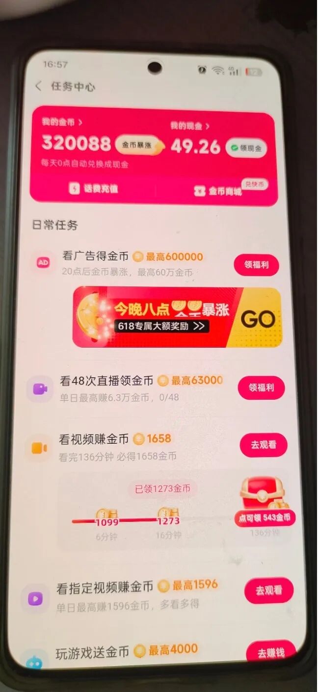 比如快手极速版,抖音极速版等等都有,我爸的话费基本上都是靠这个解决的。