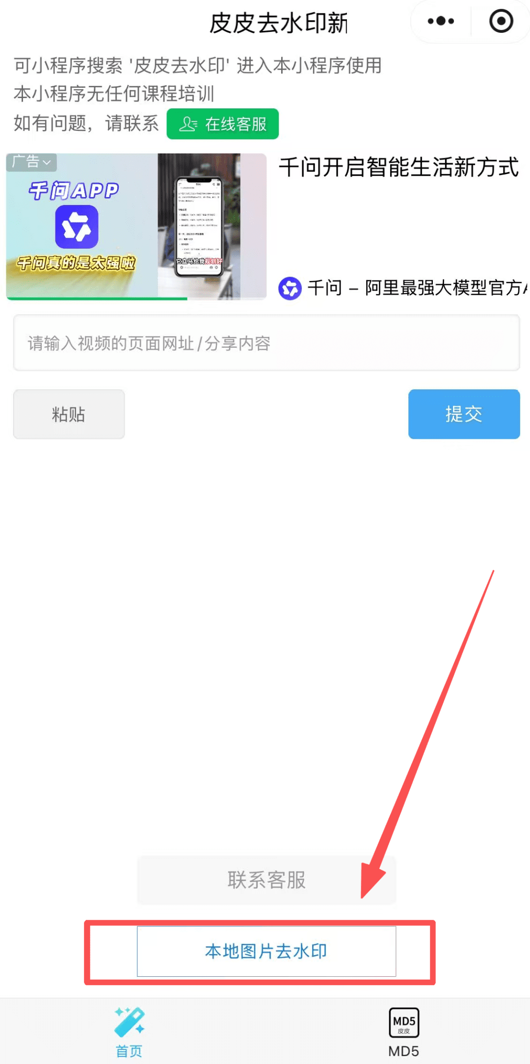 第三个方法就是用一些免费的工具,比如小程序,皮皮去水印的本地图片去水印功能,用涂抹工具,把水印去除。