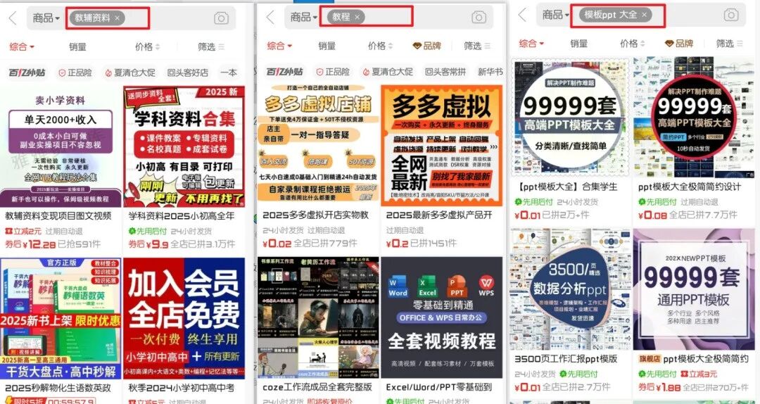 只需要在拼多多搜索关键词,比如教程、小学资料、考研资料等等,去找做的好的同行。