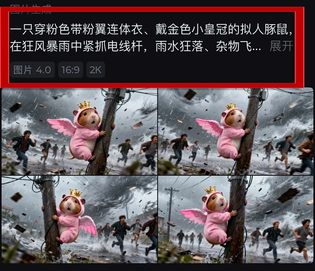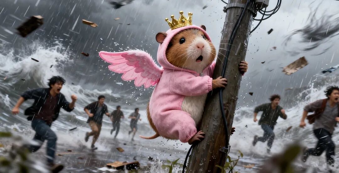 画面提示词:一只穿粉色带粉翼连体衣、戴金色小皇冠的拟人豚鼠,在狂风暴雨中紧抓电线杆,雨水狂落、杂物飞舞,背景人群在台风中惊慌奔跑,写实卡通风格,动态模糊,中景镜头,营造台风天的紧张惊魂感