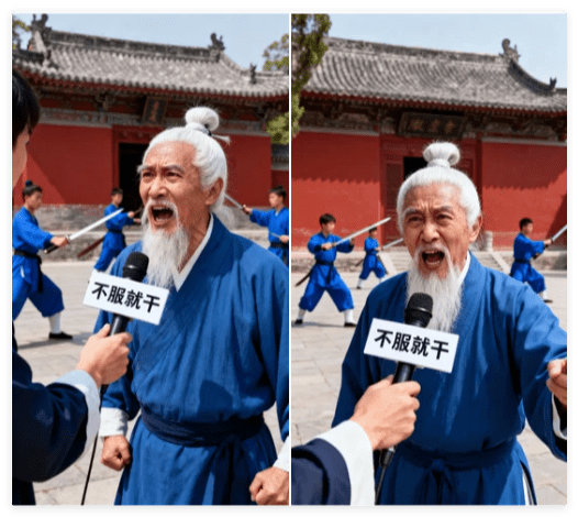 中景画面,前景是一个人拿着采访麦克风,麦克风上白色牌子黑色字体写着“不服就干”,一个穿着蓝色道服,白胡子,白头发竖着发髻的老年道长,表情激动,对着面前麦克风讲话;背景是红墙灰瓦的中式道院,有几个穿着蓝色道服的人在练剑,写实摄影,真实生活,画面自然和谐