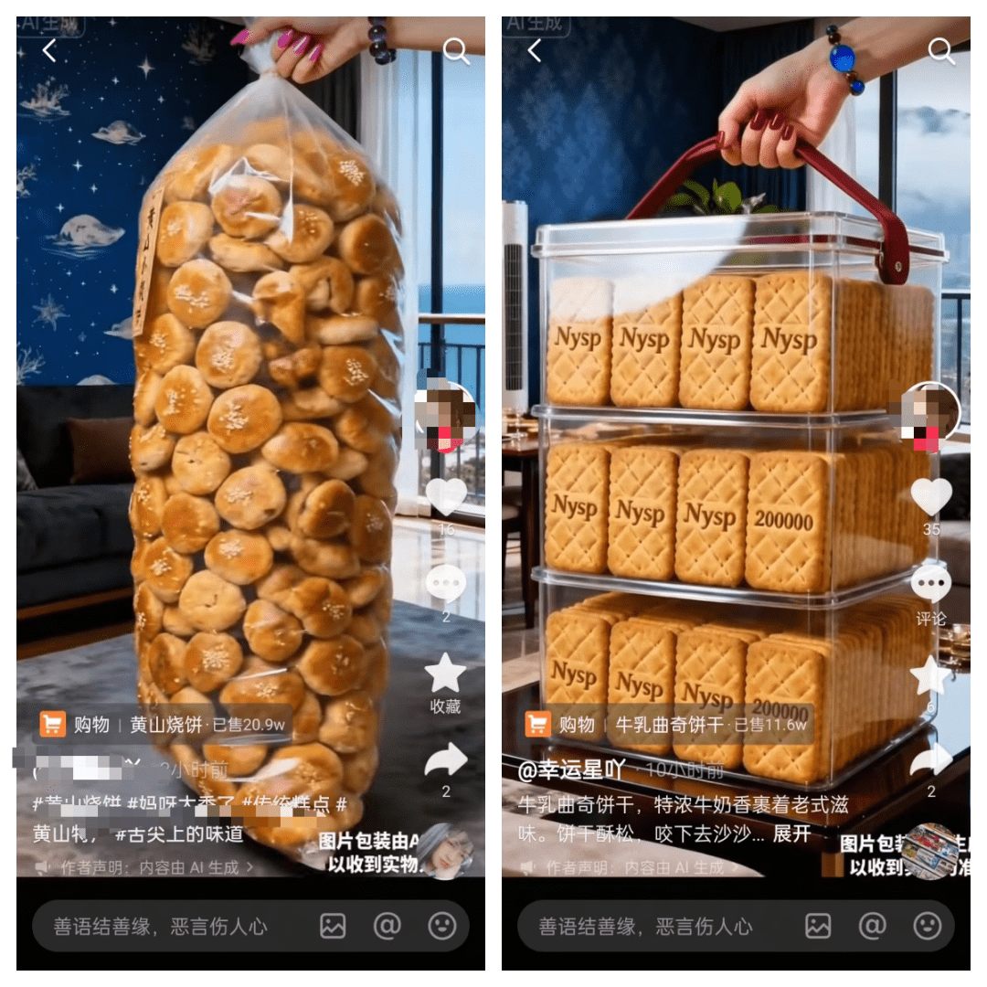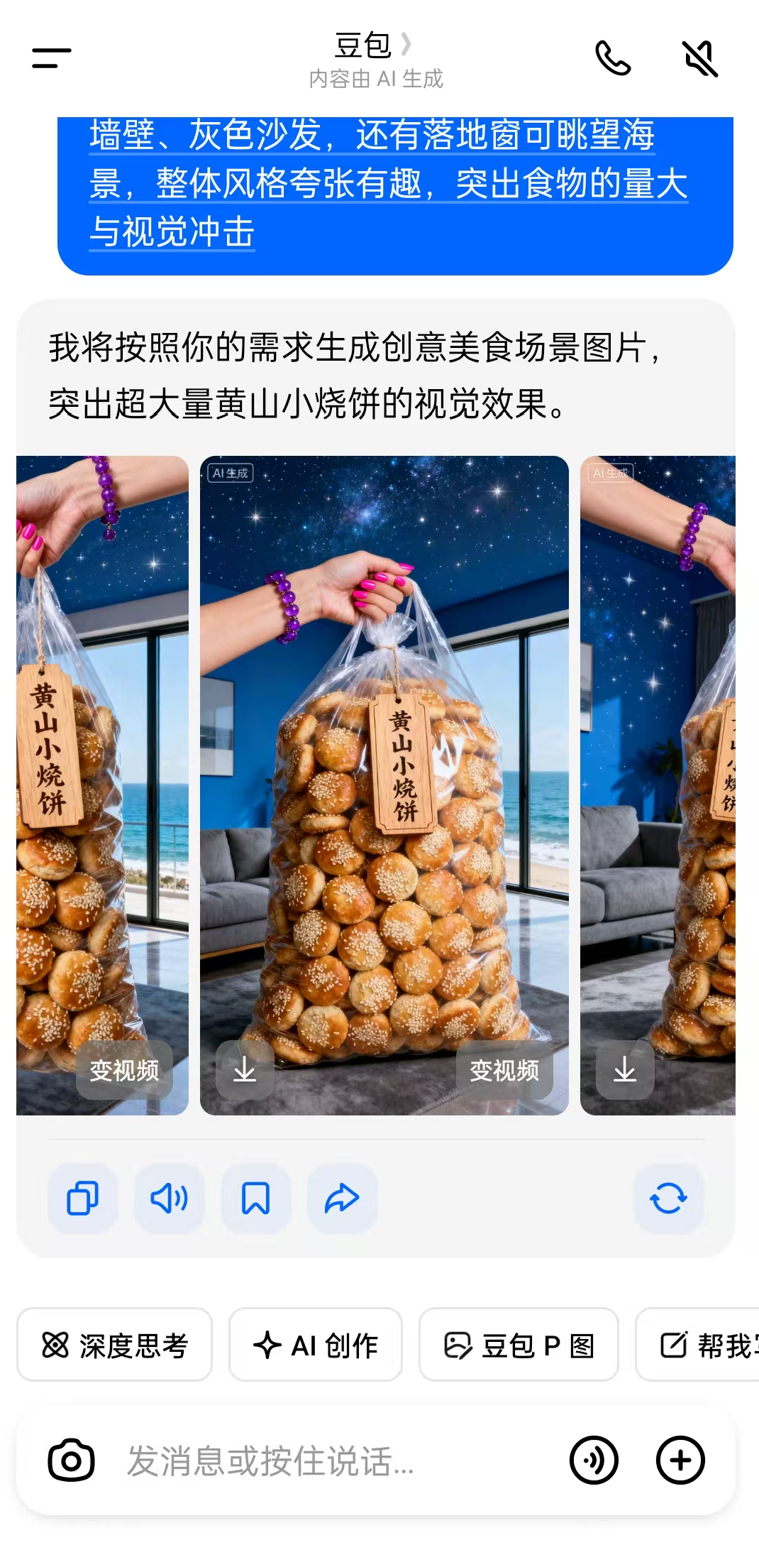 这玩法就靠一个画面:AI生成的手提着大袋零食转圈圈,简单但有效。