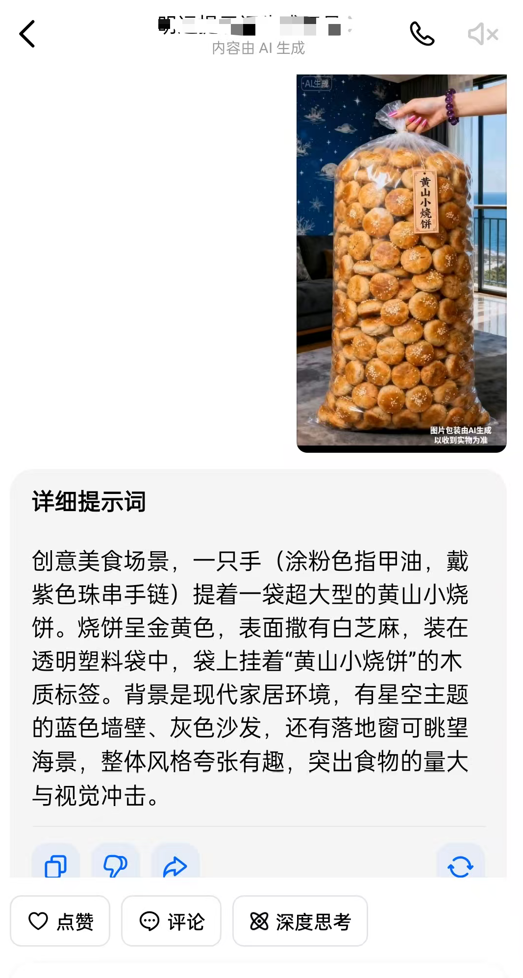 然后把图片喂给AI工具反推提示词(比如描述零食袋形态和光影细节的AI指令),重新生成属于自己的带货图片。