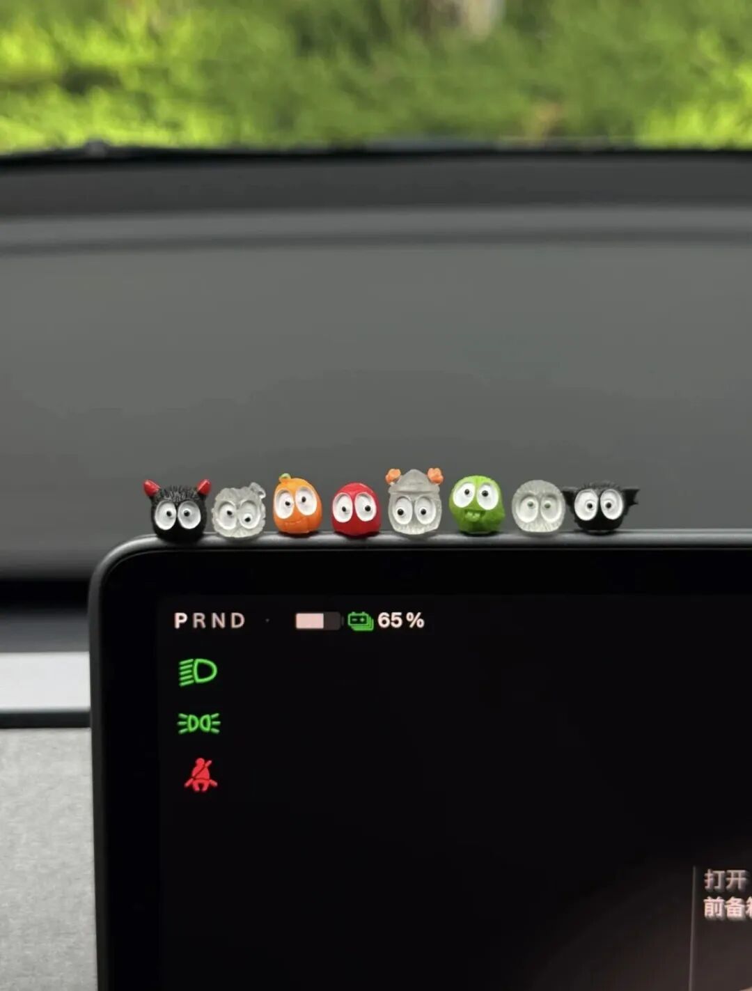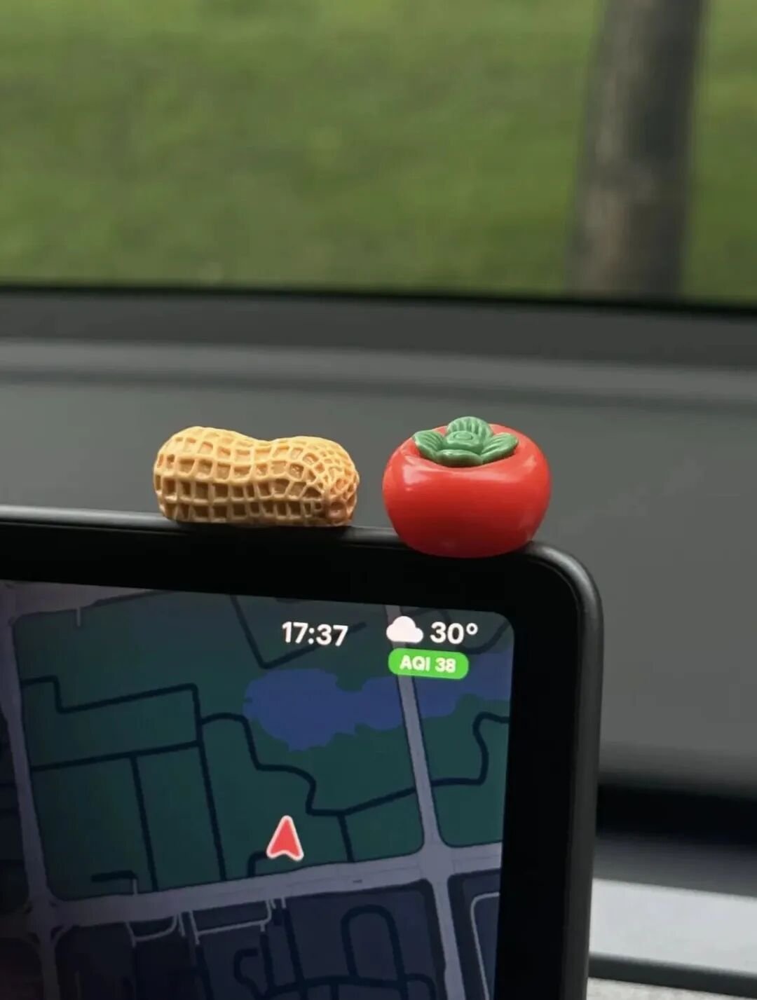 有单个摆件的精致特写,也有包含整个中控台、车窗外的环境全景,全方位展示摆放效果。车载图中,摆件放在中控屏顶部,背景是车内环境/导航界面,既突出产品,又强化真实使用的代入感,特写图用密集摆放+纯色背景,比如满筐的水果摆件,视觉冲击力强。