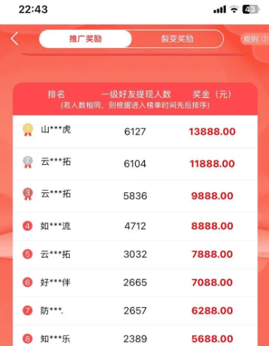 3,阶梯裂变提现奖励,这个奖励可以说是双向的,只要你的推广的用户,在平台做任务提现(满一元就可以提现),你就可以获得相应奖励。