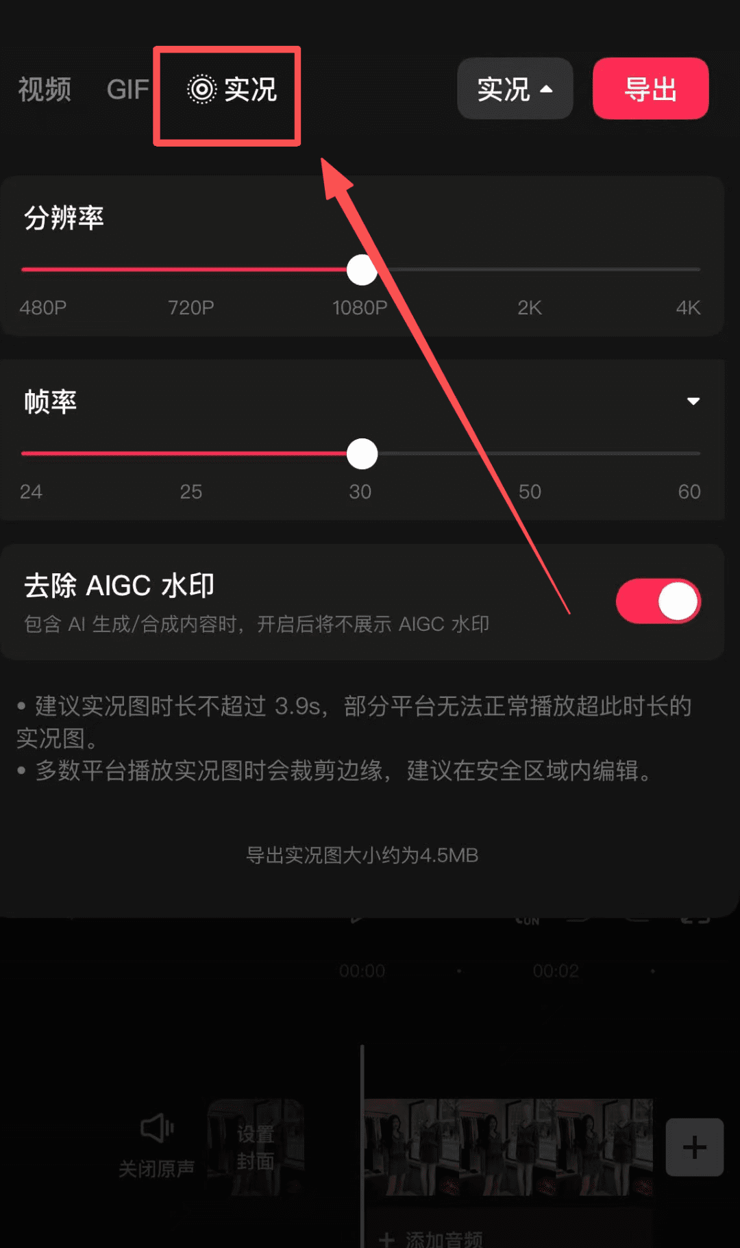 会看到有个实况的选项,点进来,选好分辨率和帧率,还有一个去除AIGC水印的选项,如果我们用即梦生图,左上角就会有一个AI生成的标识,这个选项就是去除这个水印的。