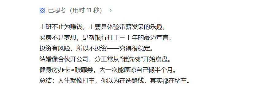嵌入多个简短直白的“金句”,对常见说法进行反转,例如:“成功主要靠后天的努力,所以今天明天我休息。”
