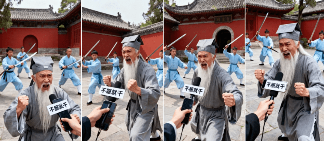一个穿着灰色道袍的长白胡子老道,戴着道士的帽子,表情激动握拳。被前方手机麦克风上写着【不服就干】的白底黑字牌子采访;背景是红墙灰瓦的中式庭院,有几个穿浅蓝色服装的人持剑练武术,画面清晰自然
