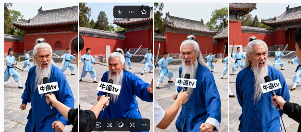 一个穿【蓝色练功服】的长白胡子老道,头发扎着,表情愤怒。被前方手里举着麦克风上写有【牛逼tv】的白底黑字牌子采访;背景是红墙灰瓦的中式庭院,有几个穿【浅蓝色色练功服】的人持剑练武术,画面清晰自然。