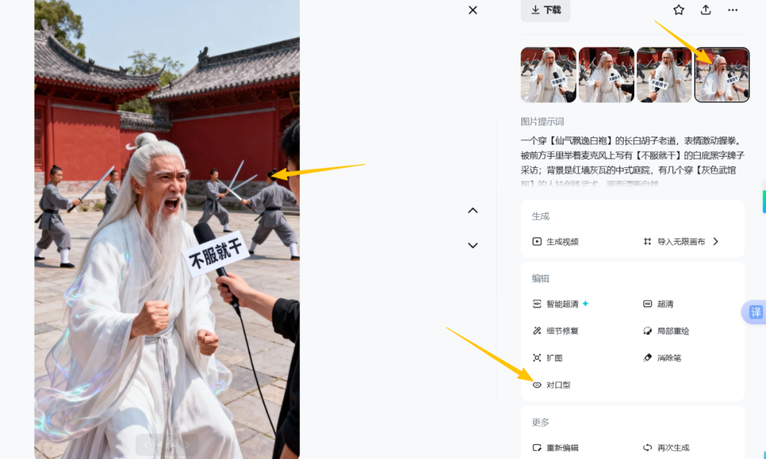 一个穿【仙气飘逸白袍】的长白胡子老道,表情激动握拳。被前方手里举着麦克风上写有【不服就干】的白底黑字牌子采访;背景是红墙灰瓦的中式庭院,有几个穿【灰色武馆服】的人持剑练武术,画面清晰自然