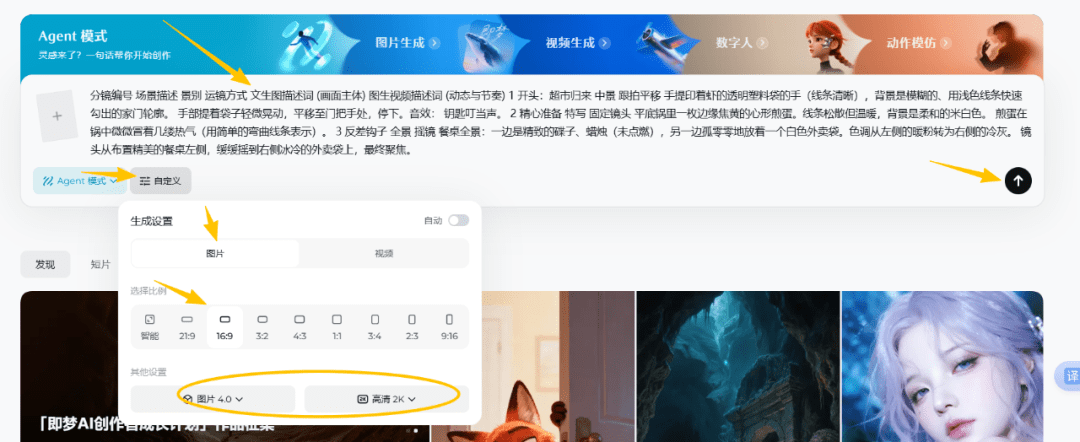 把deepseek生成好的提示词全部复制进去,自定义里,图片比例16:9,4.0模式,高清2k,