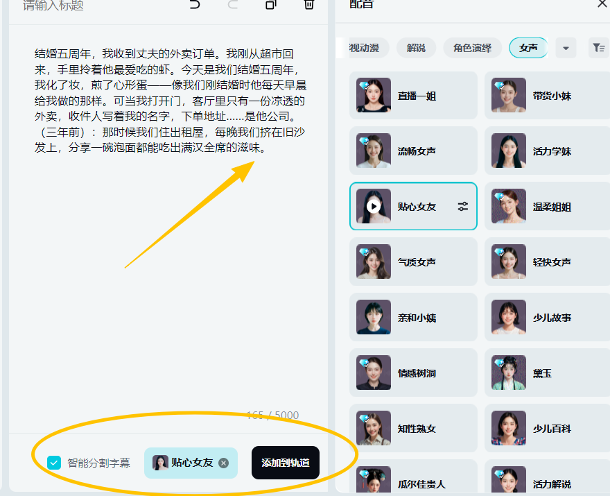 把deepseek生成的文案复制进去,然后选一个自己喜欢的音色配音,打开【智能分割】–添加到主轨道,