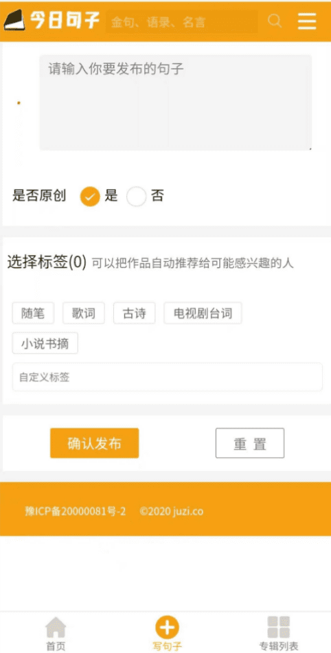 成功注册并进入平台后,找到 “写句子” 这个功能按钮并点击它,然后就可以输入选好的句子。3、写文案如果是原创的文案,直接输入文字即可;如果是非原创的文案,需要注明原作者和出处。记得要选择合适的标签,这样平台才能将你的作品推荐给可能感兴趣的人。要找到好的文案方法: