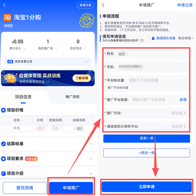 方向一:一分购(针对 365 天以上未在淘宝下单的老用户)方向二:一分购 + 5 元话费券(针对未注册淘宝的新用户)填写姓名、手机号、推广平台粉丝量、平台链接等信息,提交后等待审核,审核周期为 1 个工作日(非工作日及节假日顺延),审核通过即可获取专属推广词 / 口令码。2. 发布作品,引导用户参与
