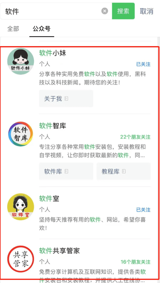 公众号名字一定要和咱们所作的行业有一定的关系,比如说可以叫XX工具库,XX软件库,大家如果实在不会选,直接在微信搜索一下软件,能出来一堆同行,大家模仿着去起就可以。