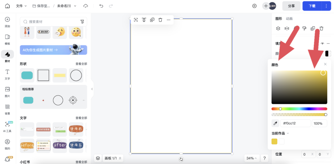 然后,我们把方框拉到3:4的位置,右边选项中,选择颜色,我们这里选择这种黄色就行。