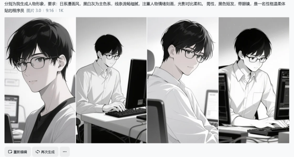 此时,我们的分镜脚本和文生图的提示词就生成啦,下一步用提示词生成图片。第二步:生成主角形象这里因为即梦AI在图片生成上效果更好,所以我们使用即梦AI进行生图。结合我的文案,故事的主角为网红女与IT男,结合两者的形象,输入提示词获取主角形象。