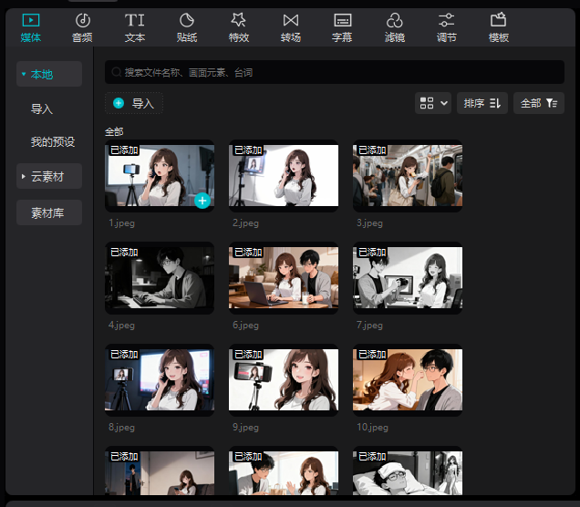 需要注意的是,即梦AI生成一张图需耗费1积分,每次抽卡会生成4张,即消耗4积分,大家注意合理使用~4、视频剪辑当我们的图片都准备好以后,就可以使用剪映进行剪辑啦~第一步:导入素材