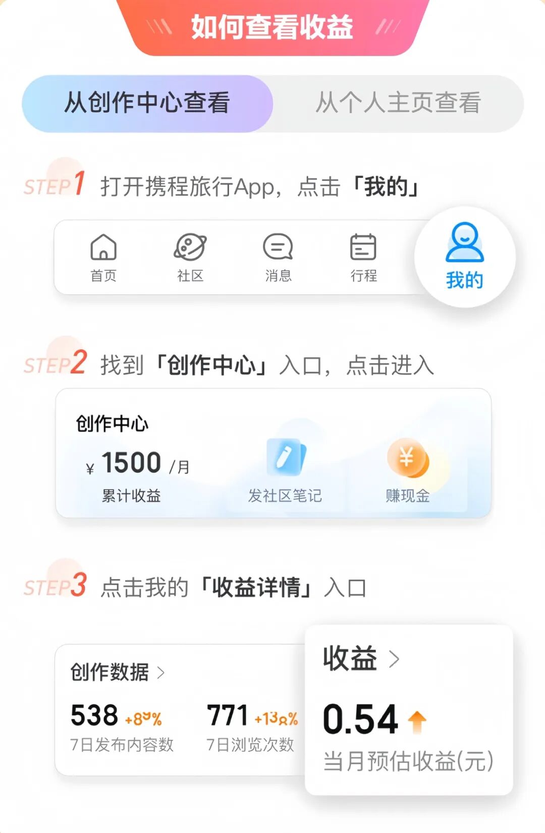 提醒一下:光去水印不够,如果你原封不动搬过来,平台会检测到重复内容,容易违规。怎么去重?可以参考文末的视频教程,操作不难。③ 查看收益发布后,在携程App里进入“我的” → “创作中心” → “收益详情”,就能看到每条笔记的流量和收入数据了。