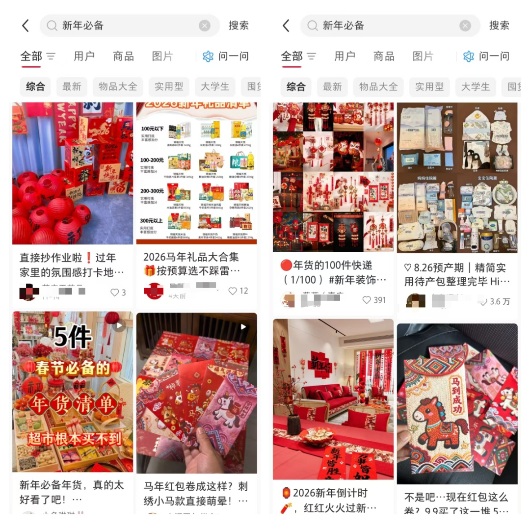 第二个问题,如果开实体店,不知道进什么货,我们可以用同样的方法在小红书搜索关键词:年货清单,就可以看到别人种草的内容了。