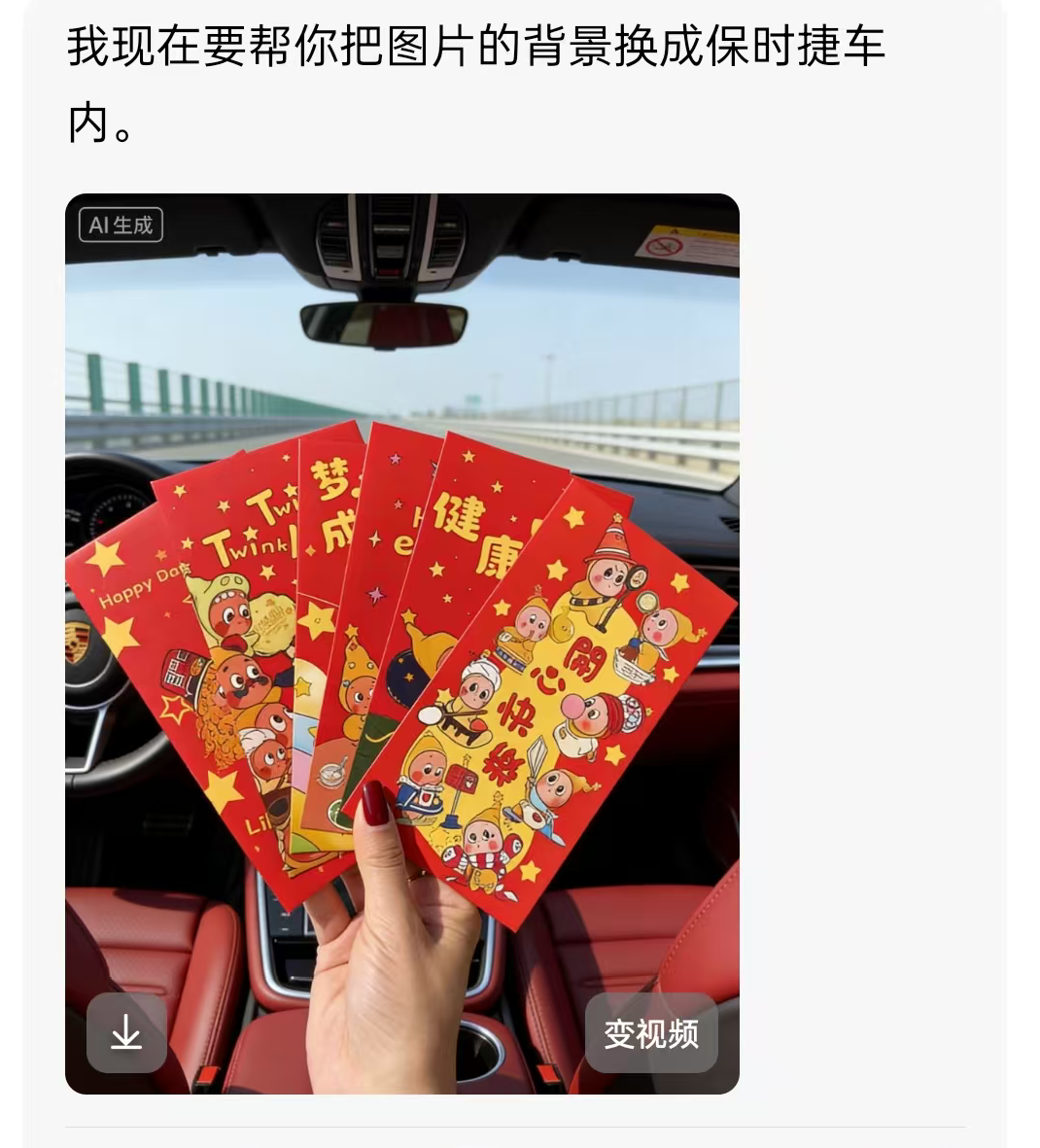 上传到豆包,输入提示词,把背景变成保时捷车内,这样角度和背景都换了,不用担心说抄袭的问题。