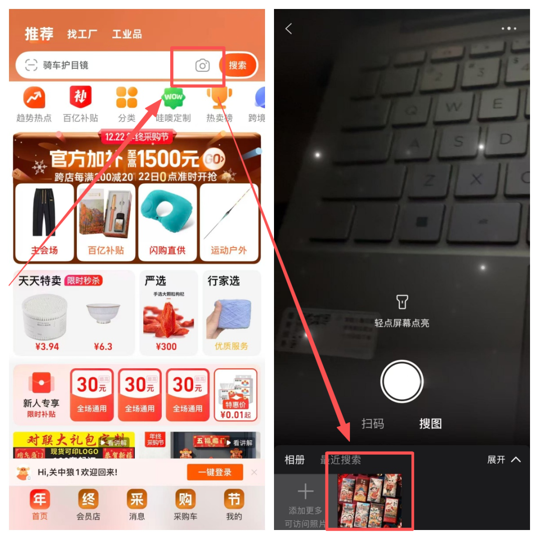 手机打开1688软件,没有的话去应用商店下载一个,打开以后点搜索框里的照相机图标,然后选择我们刚才截的图。