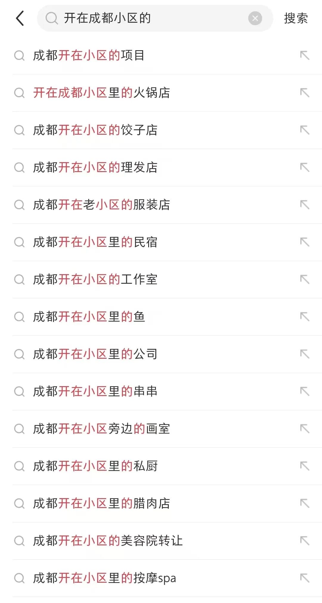 比如这里晓晓洋推荐大家搜一个词:开在某某小区的,就可以看到各种下拉词,比如火锅店,饺子店,理发店,服装店等等。