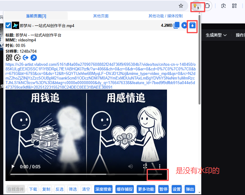 3. 视频去水印、字幕如果你是用即梦生成的AI视频可以在浏览器上安装视频下载的插件—猫抓在视频生成好以后,点击猫抓按钮,找到你要下载的视频,下载即可,没有水印