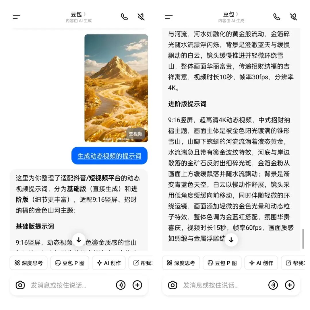 如果是做成金山下面水流动的那种效果,就需要生成视频,我们接下来以豆包为例给大家做演示。