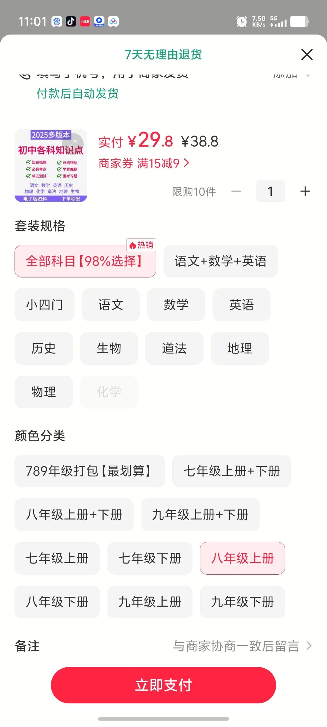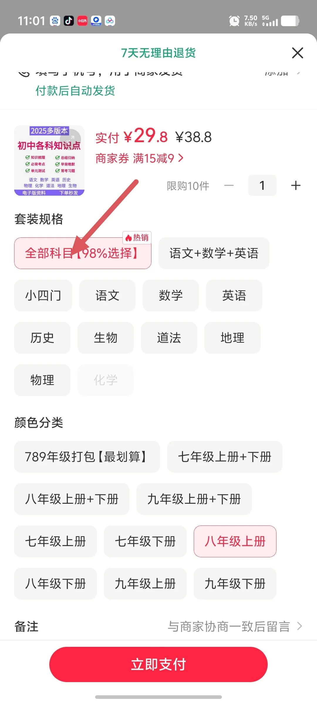 博主把这个初中各科知识点的商品,做了SKU的设置。