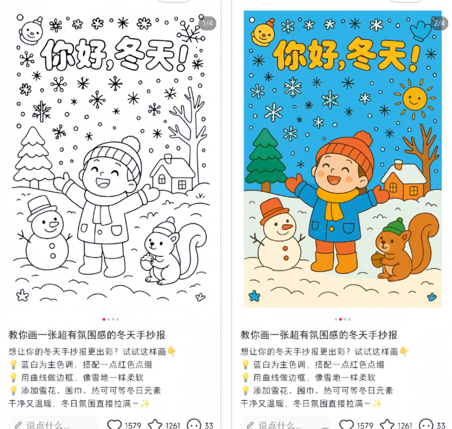 记得下载后去掉图片水印。然后用美图秀秀把彩色版和黑白版拼成对比图,这样发笔记的时候效果更直观,转化率也更高,像下图一样: