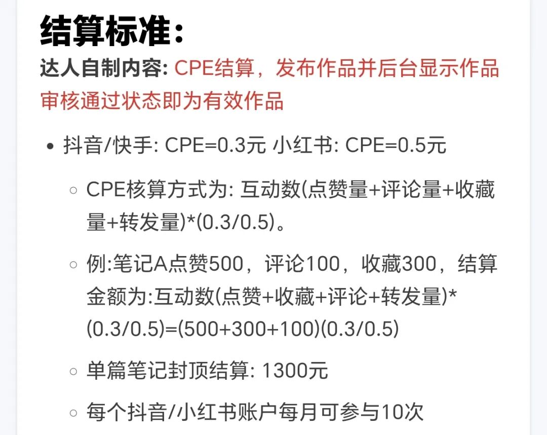 发布的作品大于30个点赞5元一篇;互动量0.3~0.5元一个,抖音0.3,小红书0.5,评论点赞收藏都可以算收益吗,单篇笔记封顶是1300元。
