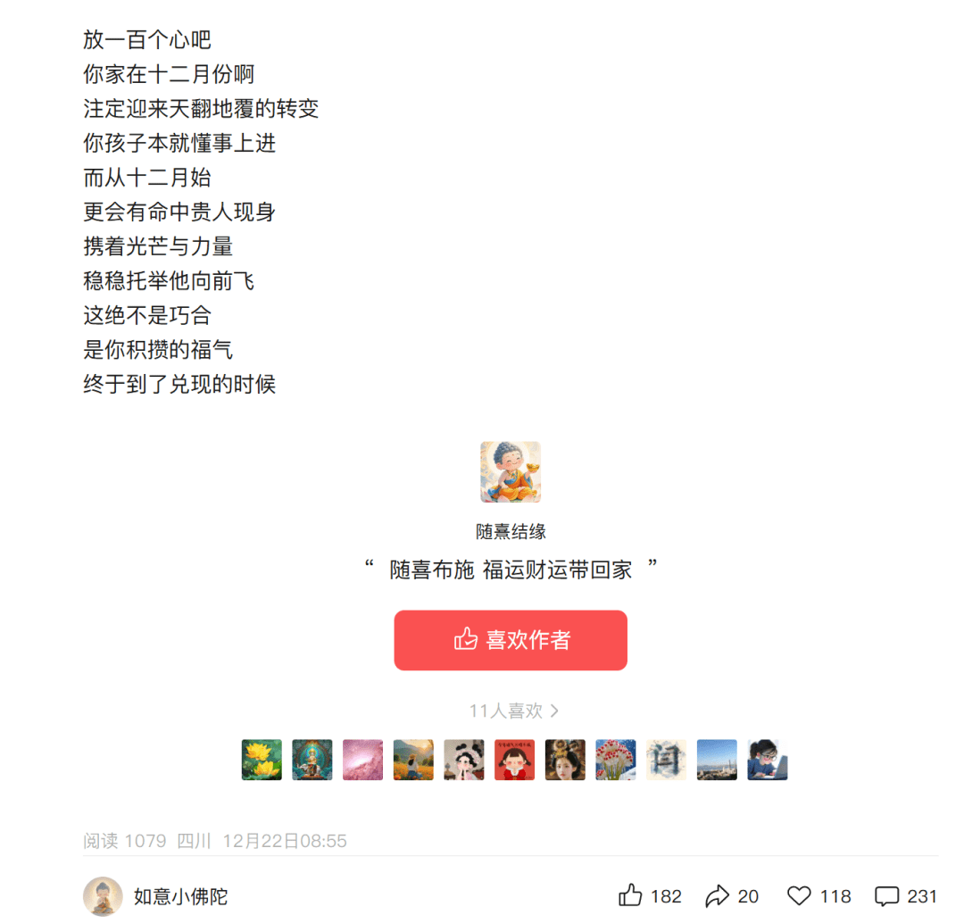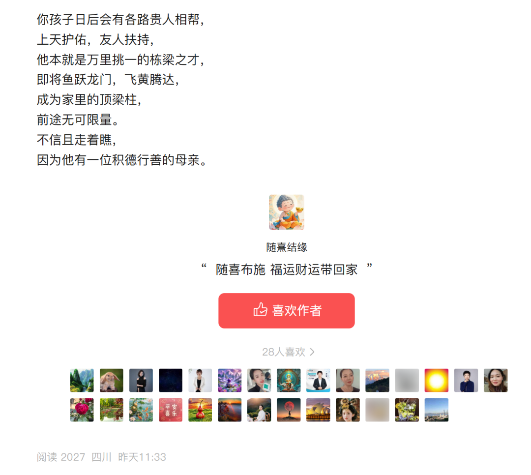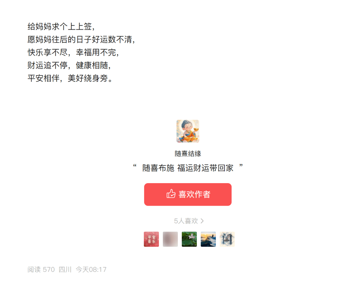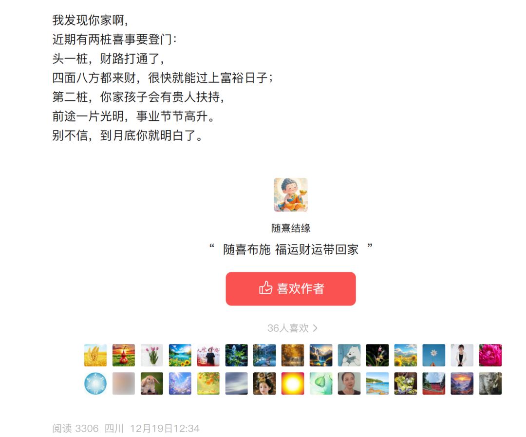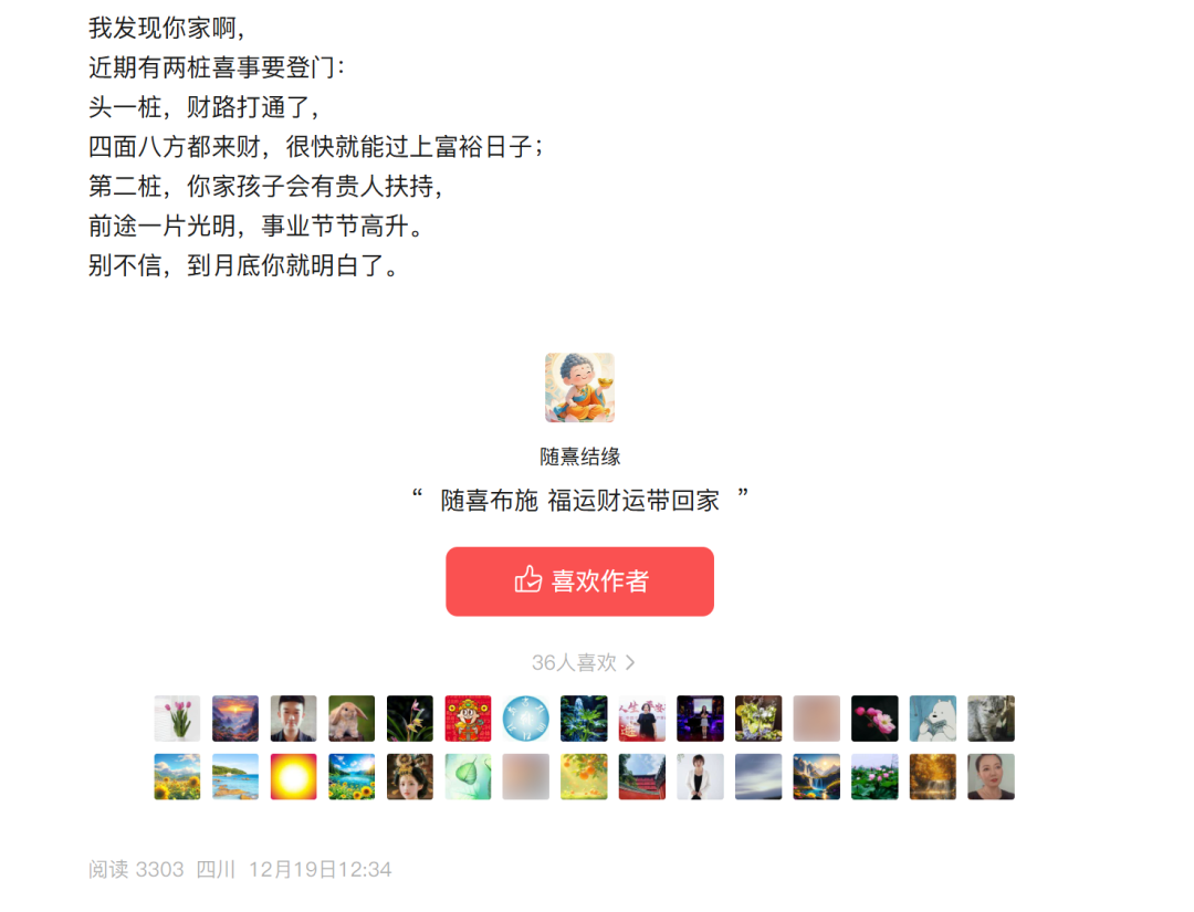 因为这条祝福信息就是单独为你而发。没错!这就是代入感,或者说参与感。所以我们去做中老年祝福赛道的时候也应该是如此。你写的祝福吉祥话,不应该是和那些复制粘贴的过年祝福短信一样,让人看了感觉毫无诚意,甚至觉得聒噪厌烦。那么问题来了,这种代入感或者说让粉丝感觉到真诚的参与感的吉祥话应该如何写呢?下面炮叔叔直接给你案例版本比如下面这篇祝福家庭的吉祥话打赏率比较高。