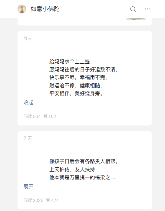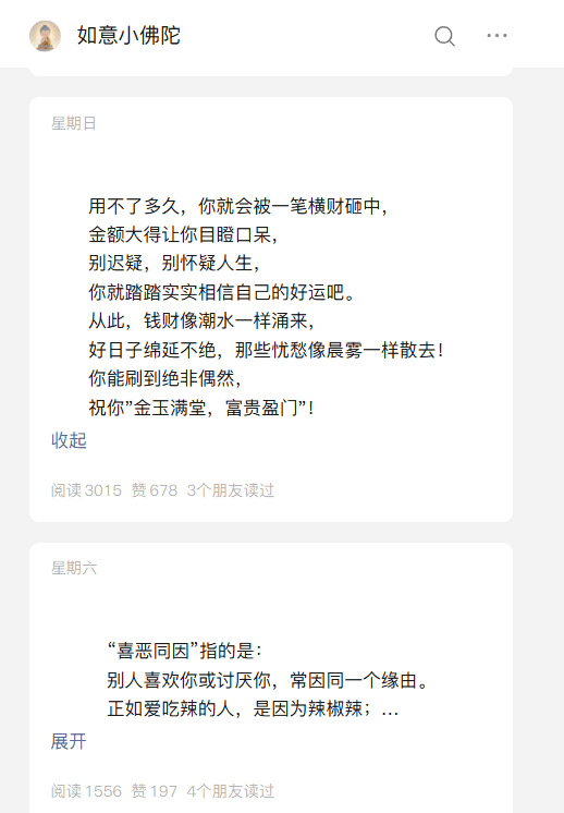 虽然不是同一个平台,但面人群和玩法本质上是一致的。都是通过说吉祥话去转化客户,不同的是一个是带货实体产品,一个是用户主动打赏。大家再看看我上面发的小佛陀文章内容打赏截图和我之前所带货的产品,能发现什么规律么?那就是文章内容和产品的定位,决定了你文章打赏和产品转化率。不同定位的文章或者产品,其打赏或者产品的客单价也会因此不同。现在的中老年人群多半都已经成家立业,儿孙满堂。