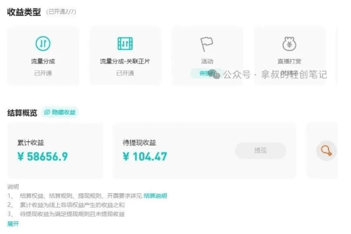5、会员分账:这个就是用户开通会员的分成,上传的内容带动会员开通或观看,就能按比例分会员收益,公式是(播放贡献+开通贡献)×(基础分成+独播补贴)。