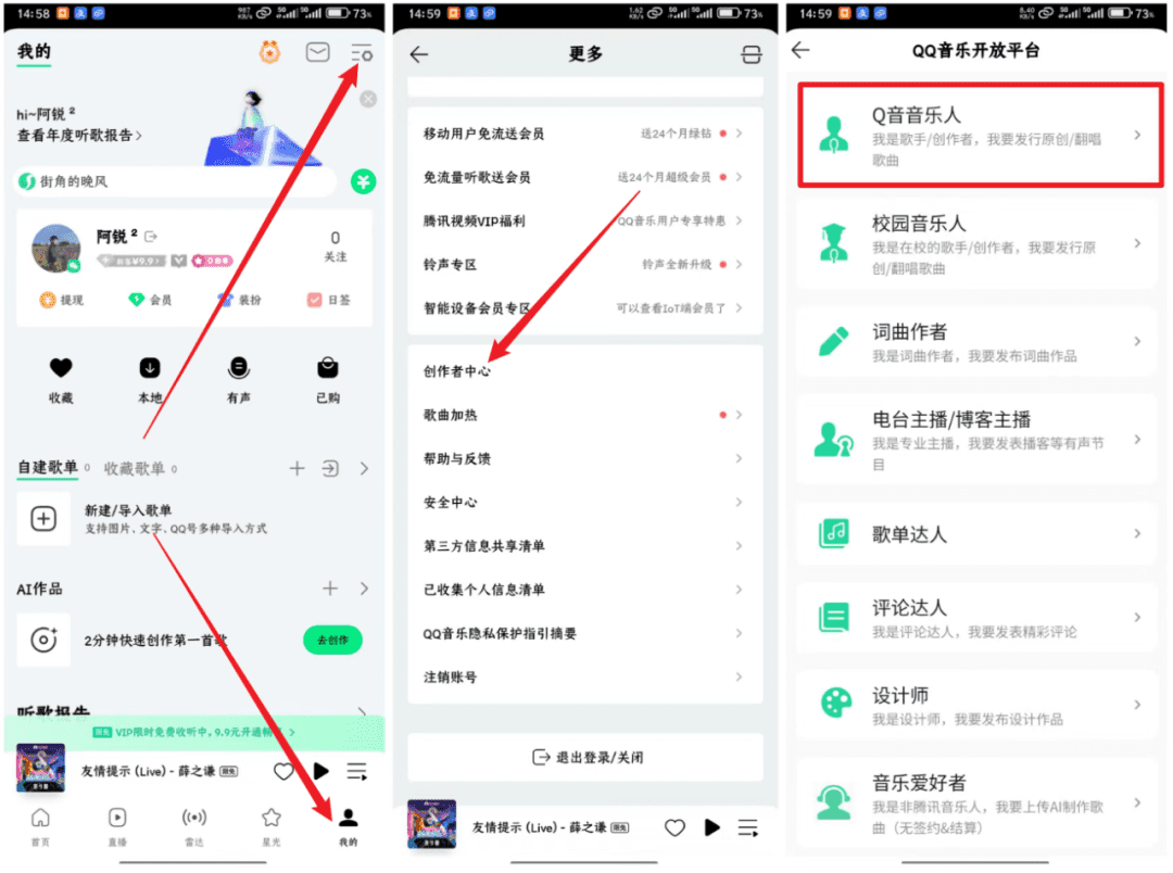 登陆成功后依次点击:我的-右上角三条杠-创作者中心。就可以看到“申请音乐人”了。