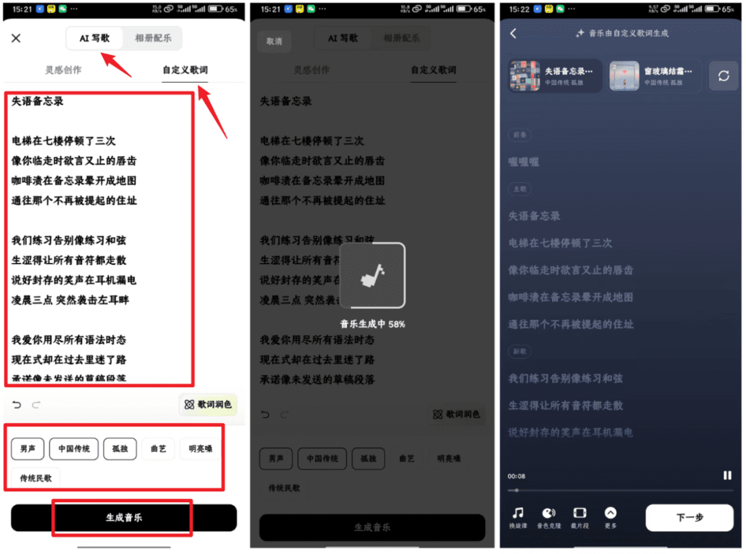 你不用会作曲,也不用会写歌词,甚至不需要自己会唱,全程都是借助ai生成歌词,再用软件合成音乐,搞定。