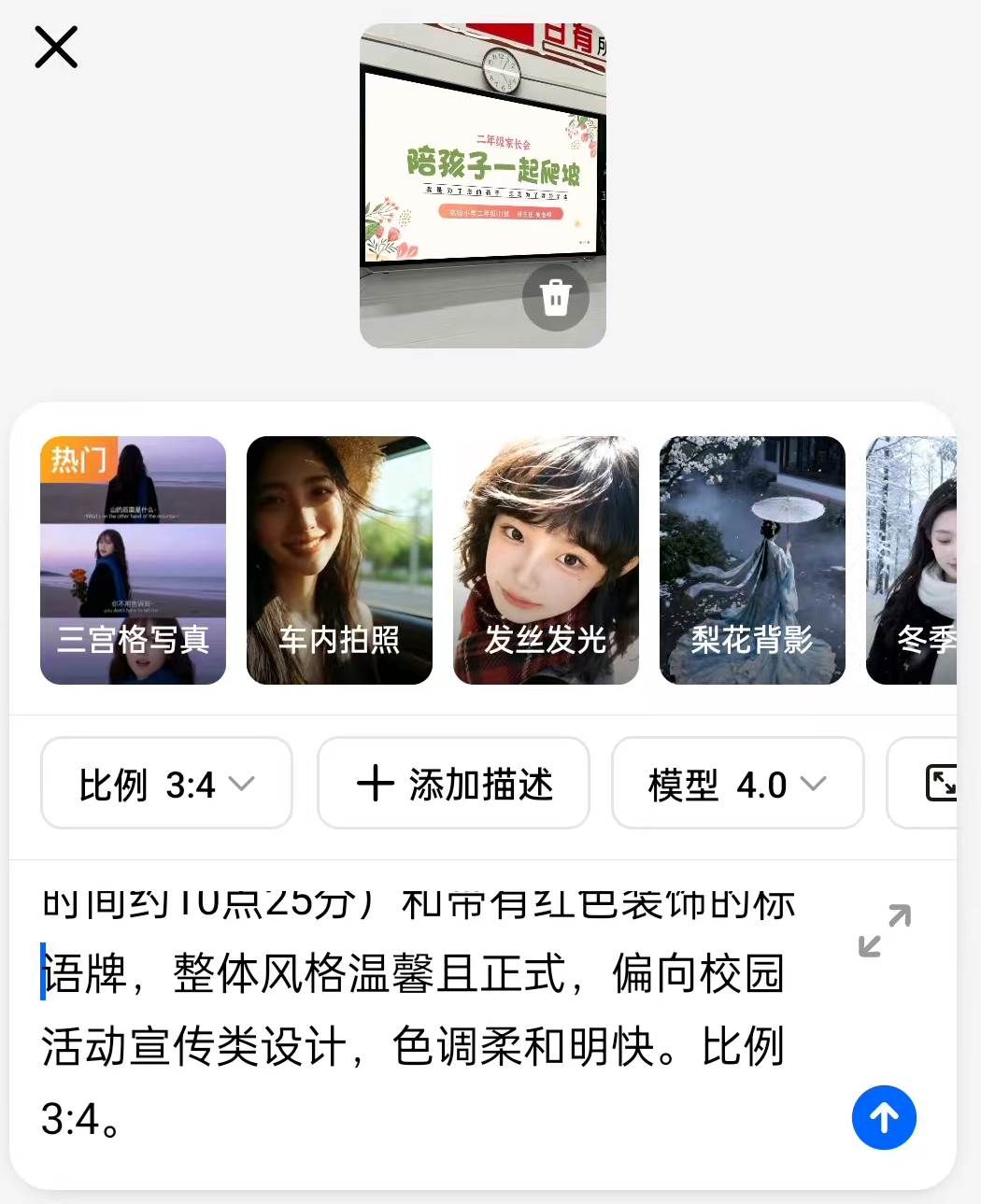 复制这段提示词,回到豆包,点进“AI创作”功能,上传刚才那张参考图,比例选3:4,然后点“生成”。