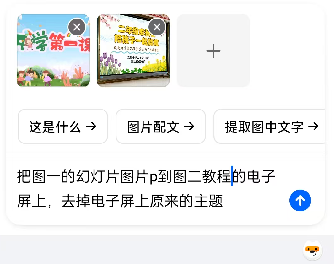 操作也很简单:同时上传你的PPT图和那张教室图,再照着下图输入指令就行。具体怎么输,看这里: