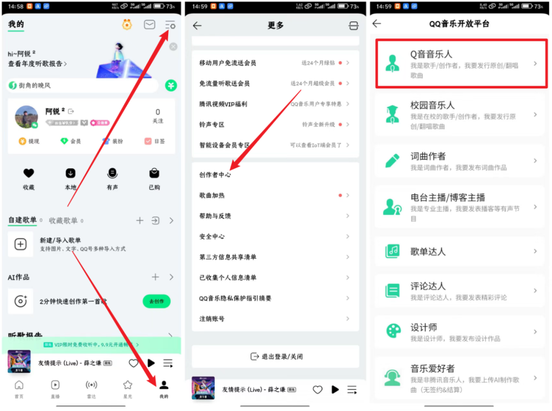 登录以后点击我的-三条杠-创作者中心,点击申请音乐人。