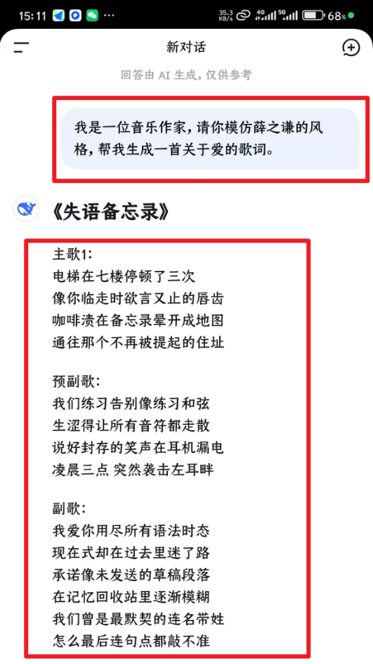 不到几分钟就可以生成歌词,不满意可以重新生成一首。