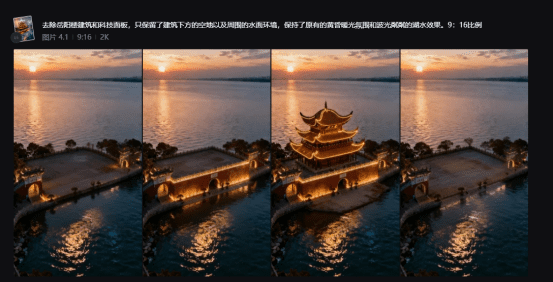 提示词:去除岳阳楼建筑和科技面板,只保留了建筑下方的空地以及周围的水面环境,保持了原有的黄昏暖光氛围和波光粼粼的湖水效果。9:16比例环境